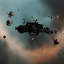 The mangled wreck floats motionless in space, surrounded with a field of scorched debris.