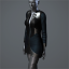 Dress like a goddess in the 'Sanctity' dress, a tight fit that accentuates your divine features. A sharp V-neck cut is framed in a detailed silvery tattoo, providing a delicate tone to your appearance, while a solid black upper front on a dark blue background is extended to metallic lines over the shoulder, waist and trim, giving the impression that the wearer is armored with righteousness, beauty, and power.