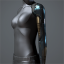 For instance, there are no unwieldy mechanical joints visible anywhere on the device. The shoulder is instead covered with a number of tiny clamps whose design conveys the sinuous curved lines of capsuleer beauty while simultaneously ensuring the shoulder has more than its full range of mobility. The elbow, likewise, appears more human than machine, thanks in good part to the superstrong stretchable material that covers it entirely in colors of summer night. Moreover, some of the traditionally larger muscles have replaced by socketed metal pumps that are nested inside one another in concentric fashion, giving a slim and tight, yet powerful impression.